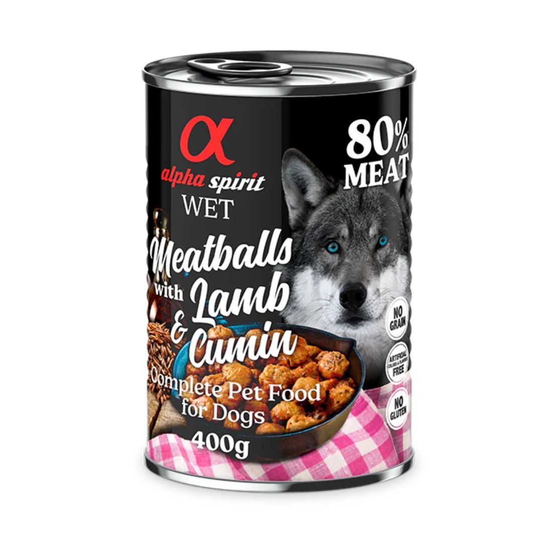 Las albóndigas de Alpha Spirit son un alimento húmedo y completo. Libre de cereales, sin gluten y sin aditivos artificiales.