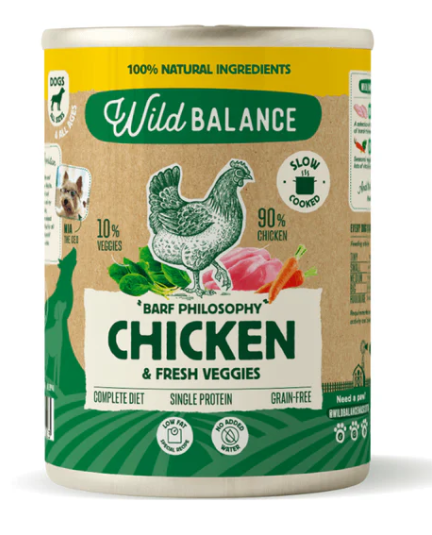 En Wild Balance somos conscientes de la importancia que tiene la alimentación para nuestros perros, por ello todas nuestras latas contienen ingredientes de calidad, con un alto porcentaje de carne y verduras (90% pollo, 10% zanahoria y espinacas), cocinados a fuego lento y con mucho amor. ¡La lata de comida cocinada para perros de pollo está para chuparse las patitas!