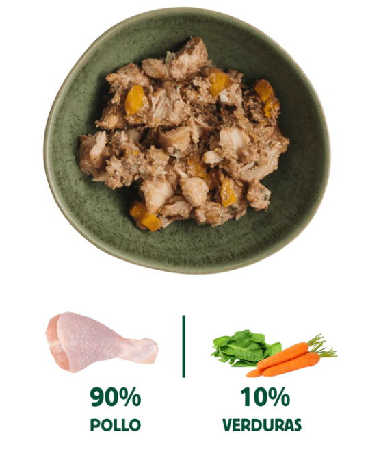 Nuestra textura con tropezones y trozos de carne le encantará a tu perro. Queremos que puedas ver exactamente lo que se va a comer tu peludo y de que están hechas nuestras latas con solo mirarlas. ¿A ti te resulta apetecible una masa de comida cocinada triturada en la que no se distingue lo que hay dentro? ¡Pues a tu perro tampoco! Cuando sirvas una de nuestras latas de comida cocinada para perros de pollo podrás ver tú mismo los trocitos de carne y verdura.