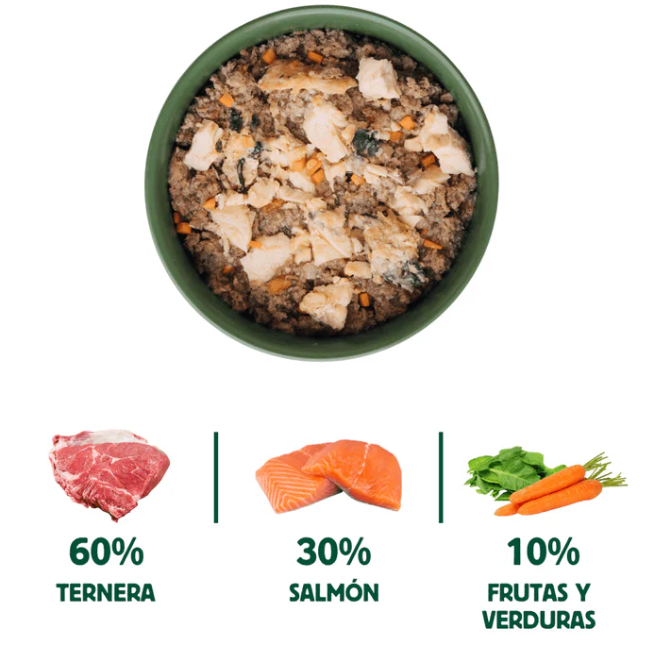 Además, las latas están cocinadas al vapor, pero sin ningún agua añadida a la receta. Manteniendo la intensidad de los sabores para deleitar el paladar de tu peludo con cada mordisco. Esto hace que sea prácticamente como poner un plato que podríamos comernos nosotros mismos en su bol, pero con un gesto tan sencillo como abrir y volcar nuestra lata de comida cocinada para perro de salmón y ternera.