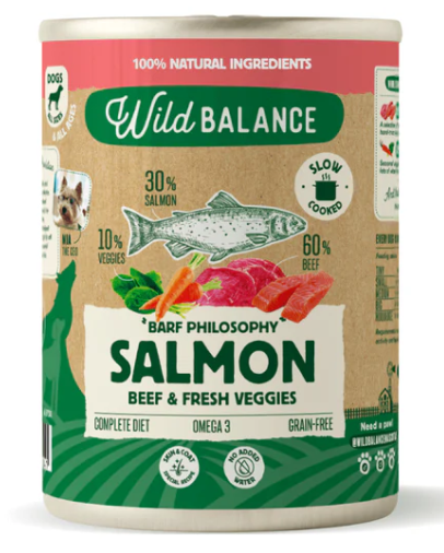 En Wild Balance somos conscientes de la importancia que tiene la alimentación para nuestros perros, por ello todas nuestras latas contienen ingredientes de calidad, con un alto porcentaje de carne, pescado y verduras (60% ternera, 30% salmón, 10% zanahoria y espinacas), cocinados a fuego lento y con mucho amor. ¡La lata de comida cocinada para perros de salmón y ternera para perros está deliciosa!