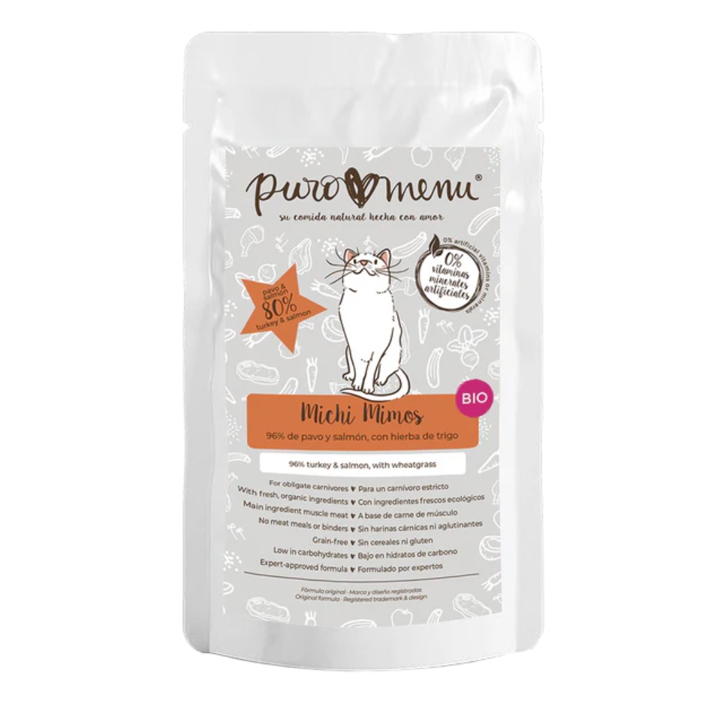Composición: Pechuga de pavo (49,5%)*, caldo de pavo (20%)*, salmón (10%)*, hígado de pavo (6,6%)*, carcasa y cuellos de pavo (6,6%)*, corazón de pavo (3,3%)*, semillas de cáñamo*, hierba de trigo (1,2%)*, levadura de cerveza, escaramujo*, ascophyllum nodosum (algas marinas)*