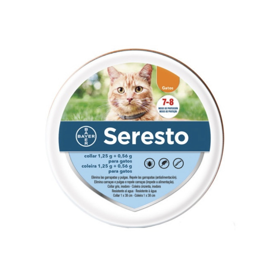 Este collar antiparasitario para gatos es apropiado para prevenir y tratar la infestación por pulgas (Ctenocephalides felis) durante 7-8 meses. También protege a tu hogar del animal, ya que inhibe durante 10 semanas el desarrollo de las larvas de la pulga. Seresto es eficiente contra las infestaciones por garrapatas durante 8 meses, gracias a su impacto repelente (en Ixodes ricinus) y a su efecto acaricida (en Ixodes ricinus, Rhipicephalus turanicus). Además es eficaz contra las larvas, ninfas y garrapatas adultas. Su eficiencia contra las pulgas es inmediata.