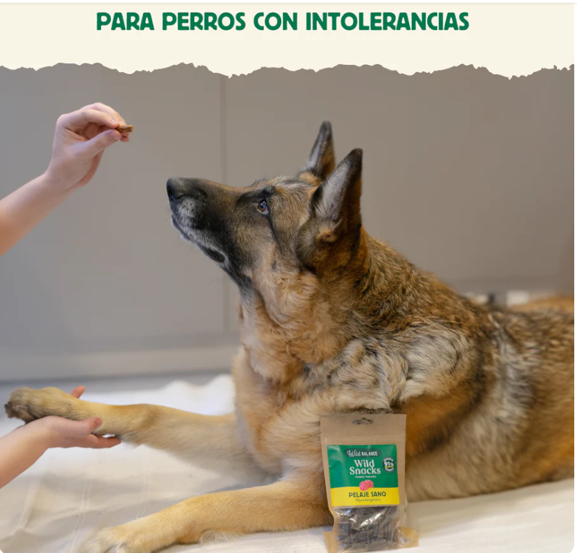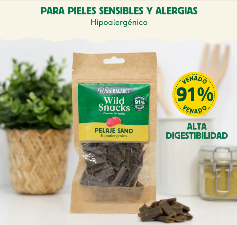 Un pelaje brillante es sinónimo de salud, y con Wild Snacks Pelaje Sano podrás cuidar la piel y el pelo de tu perro de forma natural. Estos snacks saludables para perros están elaborados con 91% de venado, una fuente de proteína altamente digestible que favorece la salud dérmica y ayuda a prevenir alergias alimentarias.